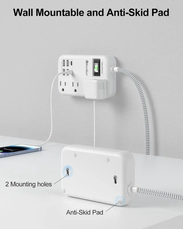 This wall mount power strip has 2 mounting holes design allows you to securely install this flat extension cord, including behind TV, workbench, garage, bedside, bathroom, laundry room, or under desk/cabinet.
