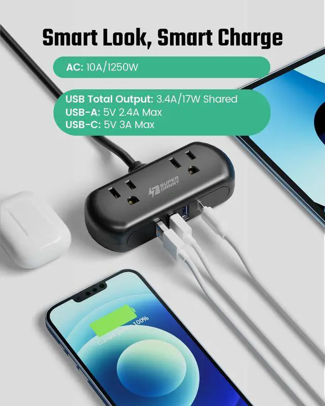 ·Smart IC Technology enables the 4 USB ports to self-adjust to charging rate to the optimum level(USB Total Output: 3.4A/17W Shared, USB-A: 5V 2.4A Each, USB-C: 5V 3A Max)