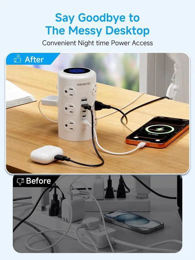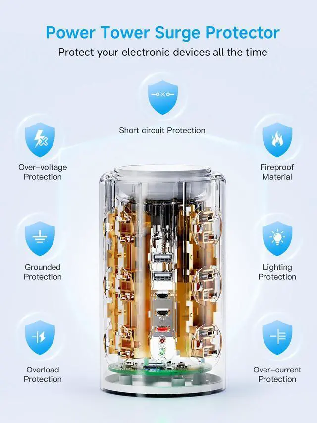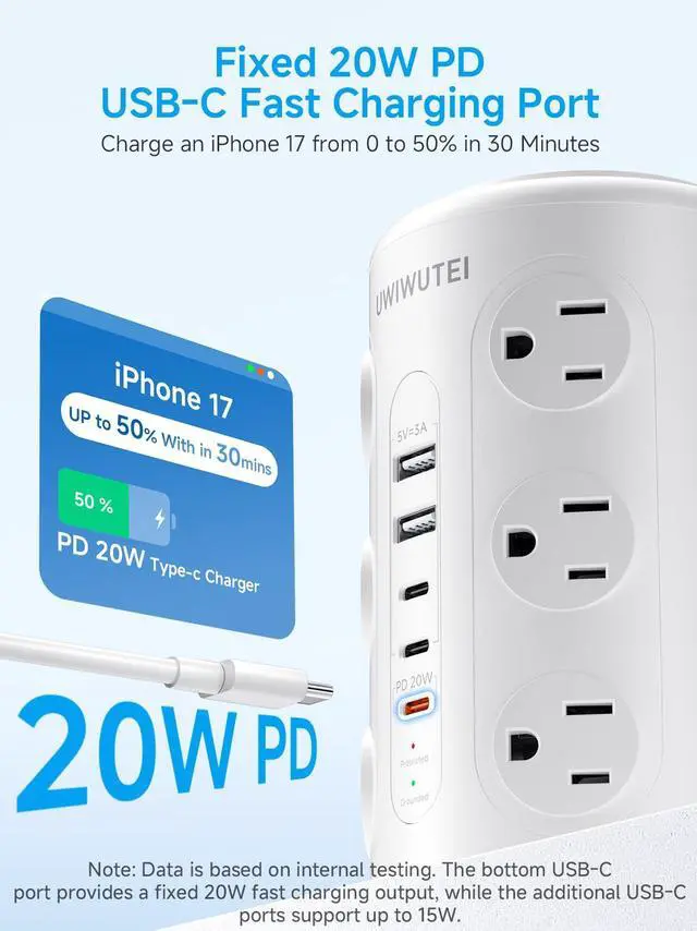 Product DescriptionTired of messy wires and insufficient outlets? Our Tower Power Strip is your ultimate solution for organized, efficient charging! Designed with both functionality and safety in mind, this 17-port charging station meets all your familys electronic needswhether at home, in the office, or on the road. With 12 AC outlets, 2 USB-A ports, and a 3-port USB-C hub (including 20W PD fast charging), it powers up to 17 devices simultaneously, eliminating the hassle of searching for available sockets. The 1.5-inch wide-spaced outlets easily fit bulky adapters, while the weighted non-slip base ensures stability even when fully loaded. Safety is our top priority: Equipped with 1800J surge protection, overload protection, and flame-retardant materials, it safeguards your valuable electronics (backed by a $300,000 connected equipment warranty and lifetime warranty). The space-saving flat plug and portable design make it perfect for dorms, RVs, bedrooms, and officesneat, reliable, and stylish enough to be a great gift! Upgrade your charging experience today with a power tower that combines performance, safety, and convenience in one sleek package.