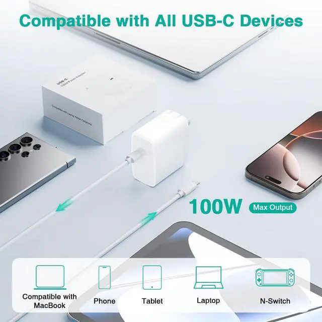 Optimized 100W Fast Charging for MacBook Pro 16": Our 100W charger is designed specifically for the MacBook Pro 16 inch, delivering optimal charging efficiency, ensuring full-speed power without overloading. Charges the Pro 16" (M4, 2024) up to 55% in just 30 minutes. Outperforms 96W and 70W chargers in stability and efficiency, while remaining fully compatible with MacBook Pro 14 inch, MacBook Air 15 13 inch. Intelligent Charging for Maximum Battery Health: This USB C laptop charger supports the high-performance demands of M1, M2, M3, and M4 chips with intelligent power output support (100W/96W/87W/70W/65W/45W/30W/20W, etc.). Built-in smart charging technology maintains up to 99% maximum battery capacity and ensuring longer battery lifespan compared to other chargers. Universal Compatibility: Widely compatible with MacBook Pro 16 inch (M4,2024), MacBook Pro 14 inch (M4,2024), MacBook Air 15 inch (M4,2025), MacBook Air 15 inch (M4,2025), MacBook Pro 16 inch (M3,2023), MacBook Pro 14 inch (M3, 2023), MacBook Pro 16 inch (M2, 2022), MacBook Pro 14 inch (M2, 2022), MacBook Pro 16 inch (M1, 2021), MacBook Pro 14 inch (M1, 2021), MacBook Air 15 inch (M3, 2024), MacBook Air 15 inch (M2, 2023), MacBook Air 13 inch (M3, 2024), MacBook Air 13 inch (M2, 2022), iPad Pro Air, iphone 16 Pro, etc. Ultra-Compact & Extra-Long 6.6ft USB-C Cable: Our 100w laptop power adapter is smaller than the original 140W/96W/70W models. Perfect for on-the-go use, delivering high-speed charging in a pocket-sized build. Includes a durable 5A USB-C to USB-C cable, max 100W power delivery and 480Mbps data transfer. Tested for 20,000+ bendsensuring longer lifespan than standard cables. Superior Safety and Reliable: Built-in multi safeguards and cooling system to protect against overcharging, short circuiting, overheating, spark, intelligently monitoring temperature to safeguard your devices.