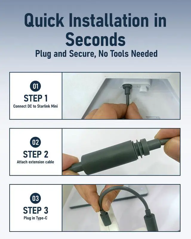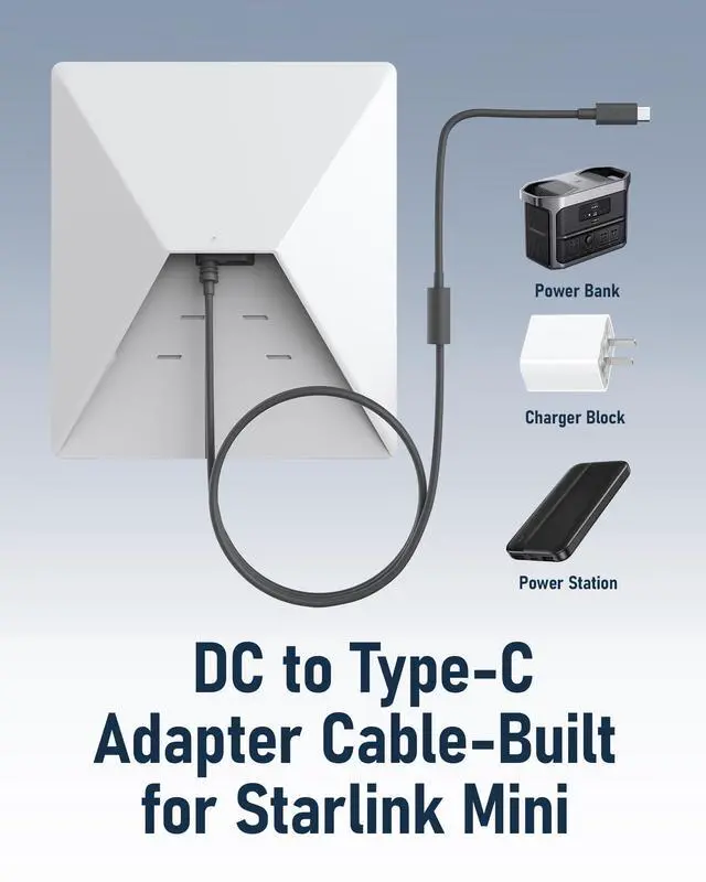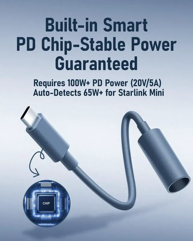 Power your Starlink Mini anytime, anywhere with this USB-C to DC adapter. Built with a smart chip for stable output, it supports 65W+ PD chargers, power banks, and car adapters. The plug-and-play design ensures quick connection, while the compact, waterproof build makes it ideal for outdoor use in any weather.