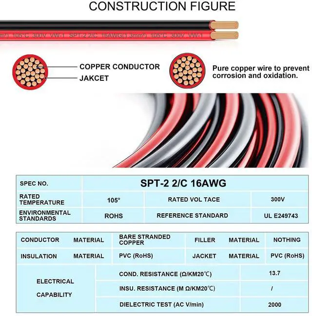 | Cable Spec | Sun protection: UPF 50+ | SPT-2 16AWG (1.31mm²) /2C | SPT-2 14AWG(2.08mm²)/2C | SPT-2 14AWG(2.08mm²)/2C | SPT-2 16AWG (1.31mm²) /2C |