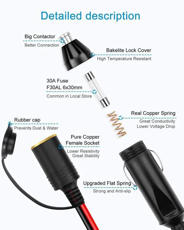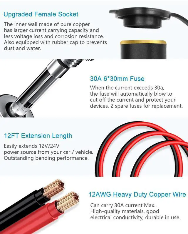 When the current exceeds 30a, the fuse will automatically blow to cut off the current and protect your devices. With 2 spare fuses for replacement.