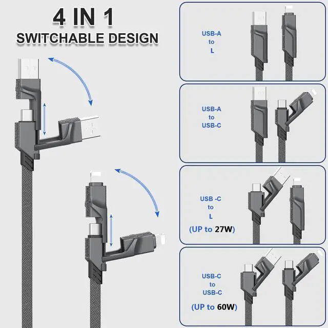 | Special Feature | 4 in 1 Versatility, Data Transfer, Flat Nylon Braided, PD 60W 27W Fast Charging, Zinc Alloy Material |