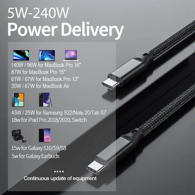 3.Up to 240W 48V@5A Pass through supporting Power Delivery, comparable to the full speed original cord (Actual charging speed depends on your device and wall charger, with 140W original charger at a full 140W, with 96W orginal charger at a full 96W)