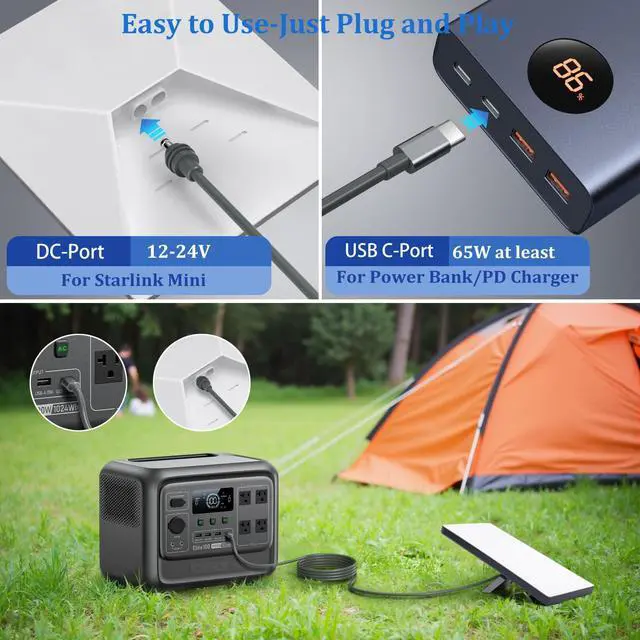 The USB-C to DC connection is perfect for powering your Starlink Mini with a compatible power bank or pd charger with power delivery of 60W or more. It enable you to maintain your internet connection during power outages or when you are on the go, making it an essential accessory for traveling, camping, or as an emergency backup.