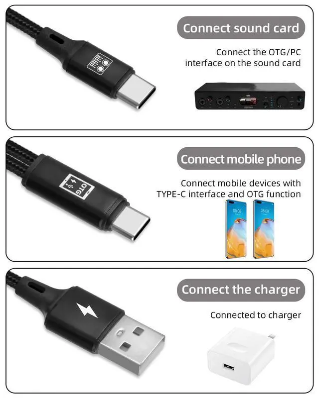 5.USB to TYPE C Cable: The USB C Charging port is compatible with phones with USBC port. USBC soundboard port is suitable for most sound card. Whether you're a seasoned streamer or just starting out, this cable is a must-have for your toolkit. NOTE: USBC OTG Branch cable is for connecting sound card only , not support general otg function for other devices.