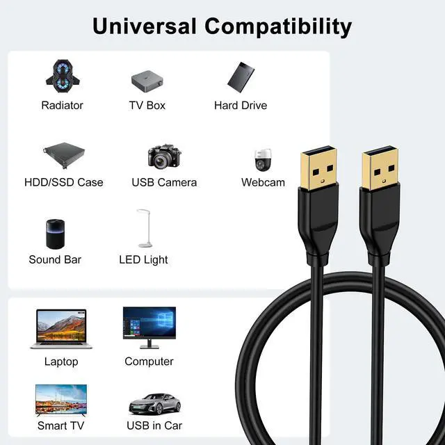 • USB to USB Cable 3.0 6FT:USB to usb cable is usb a to usb a cable (male to male) instead of male to female or another USB C, USB B, Micro B connect port. 2. This uab a cable DO NOT support data transmission between two PCs/Laptops. 3. This usb cord DO NOT support video-output.