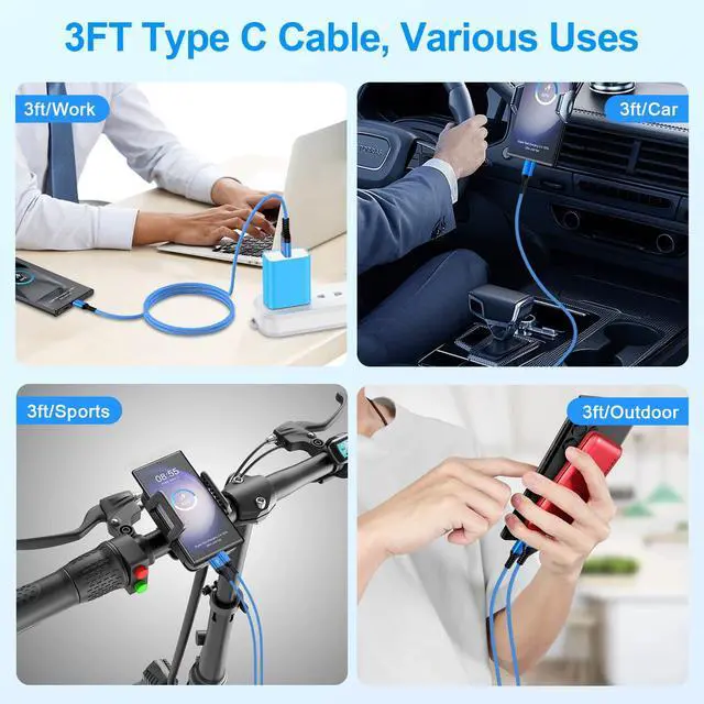 2 Packs 3 FT USB C iPhone 16 Plus Car Charger Cord (Blue, Purple)