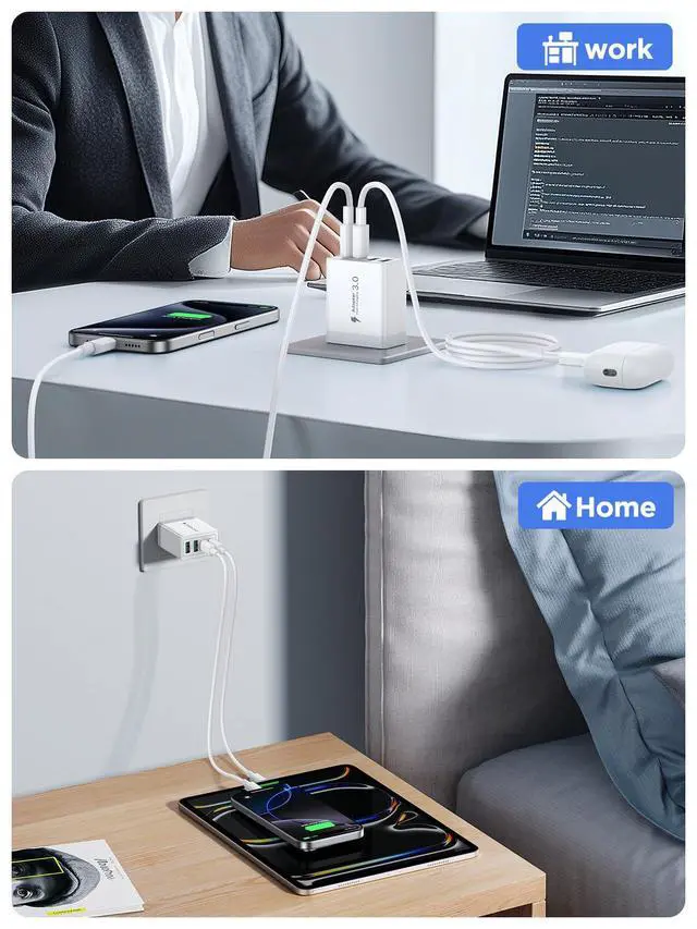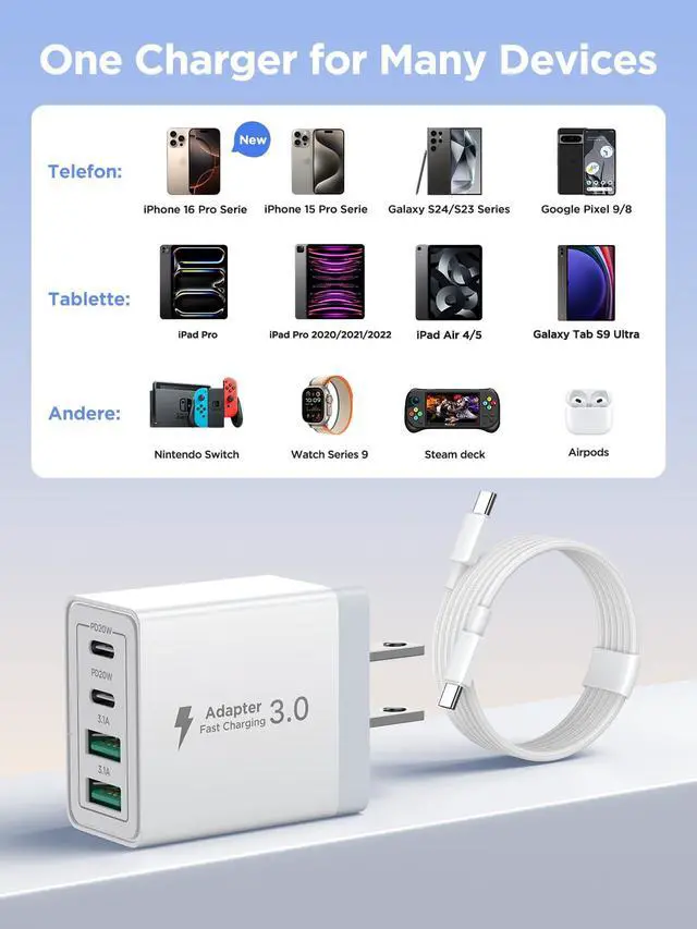 Universal Compatibility:Due to the special 4-port,the USB charger is compatible with almost all electronic devices,charging adapter for iPhone 16/16 Pro/16 Pro Max/15 Plus/15/15 Pro/15 Pro Max/14/14 Pro/14 Pro Max/13/13 Mini/13 Pro Max/12/12 Pro Max/12 Pro Max/12 Mini/SE 2020/11/11 Pro/11 Pro Max/XR/XS/X/8/7, iPad Pro 12.9 2022, iPad Mini 6, iPad Air 5, MacBook Pro/Air, Samsung S24,S23,S22,S21,S20,S10,S9,S8,A71,A70s,A90,A51,Note 20/10 and other digital devices.Combined with the 60W USB-C to USB-C cable, can maximize charging speed