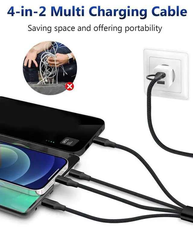 Our 4-in-2 usb c multi charging cable is a versatile and efficient solution for charging multiple devices simultaneously. It converts USB-A ports to USB-C, making it compatible with all charger adapters and allowing you to charge four USB-C devices at once, perfect for home, car, office, or travel.