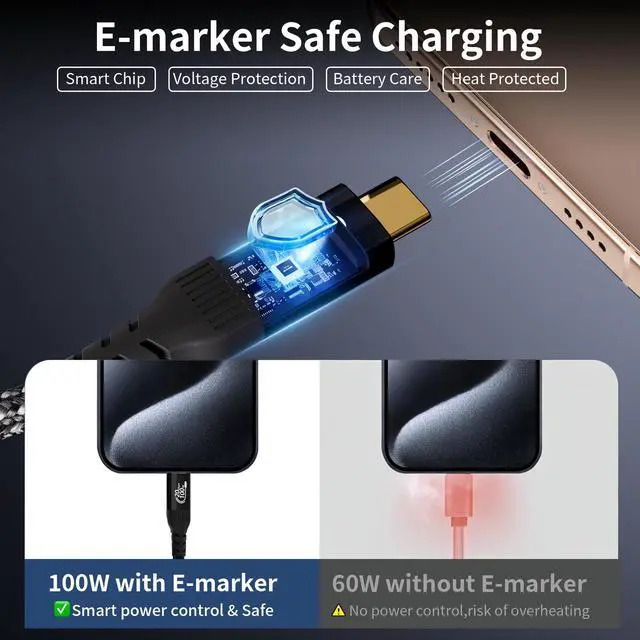 - 100W Ultra-Fast Charging: Power Up in Minutes, Not Hours Certified PD 3.0 compliant, this USB C Cable 100W delivers a massive 100W (20V/5A) chargeenough to fuel a 16-inch Laptop from 0 to 85% in just 35 minutes. As a premium USB C to USB C charging cable, it intelligently adapts to your devices needs, working seamlessly with 100W/65W/30W chargers. The built-in E-Marker smart chip prevents overcharging, overheating, and current surges, keeping your expensive USB-C devices safe and extending battery life.