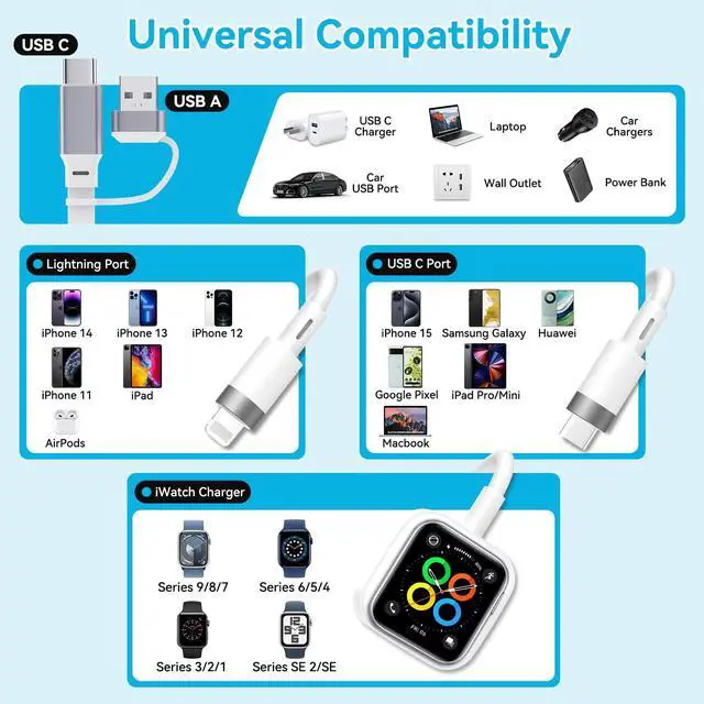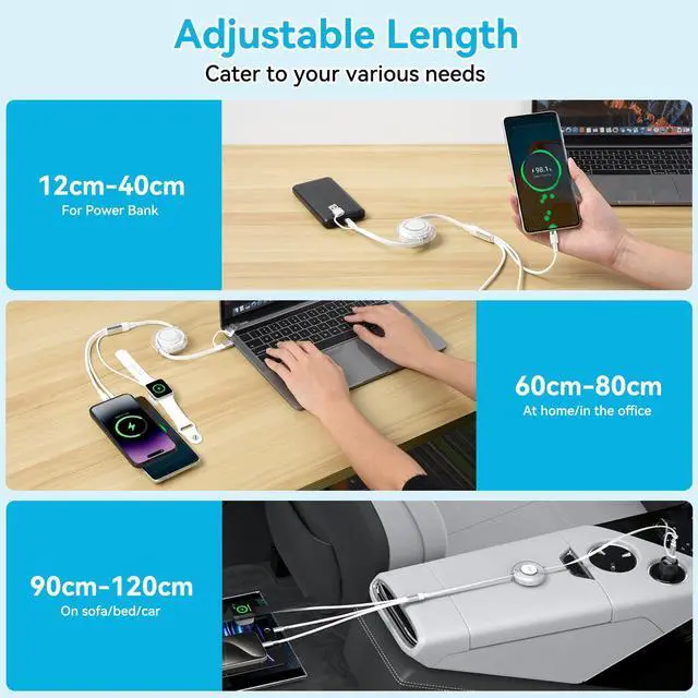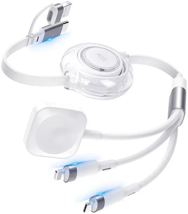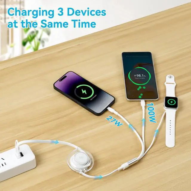 3 in 2 Retractable Fast Charging Cable100W multi charger cable can satisfy multiple charging demands for you. It comes with 2-in-1 USB A/Type C port, offering 3 output ports: Type C, Lightning and magnetic watch charger. It supports fast charging 3 devices at the same time: USB C/A to USB C port, USB C/A to Lightning port and USB C/A to iWatch. Take 1 cable can meet all your charging needs, delivering your life more convenient.