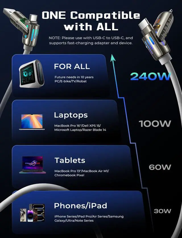 [Time-Saving 240W Fast Charging & Data Sync] Experience ultra-fast usb to c cable with the USB C to USB C port: Just 35 minutes, it can charge your iPhone 16 to 96%, Switch to 90%, Samsung S23 to 96%, MacBook Pro to 86%, and iPad Pro to 89%. Just ensure you're using a compatible USB-C adapter with sufficient power for optimal results.It is worth mentioning that any combination of connectors has a data transfer speed of 480Mbps, 1200 songs per minute.