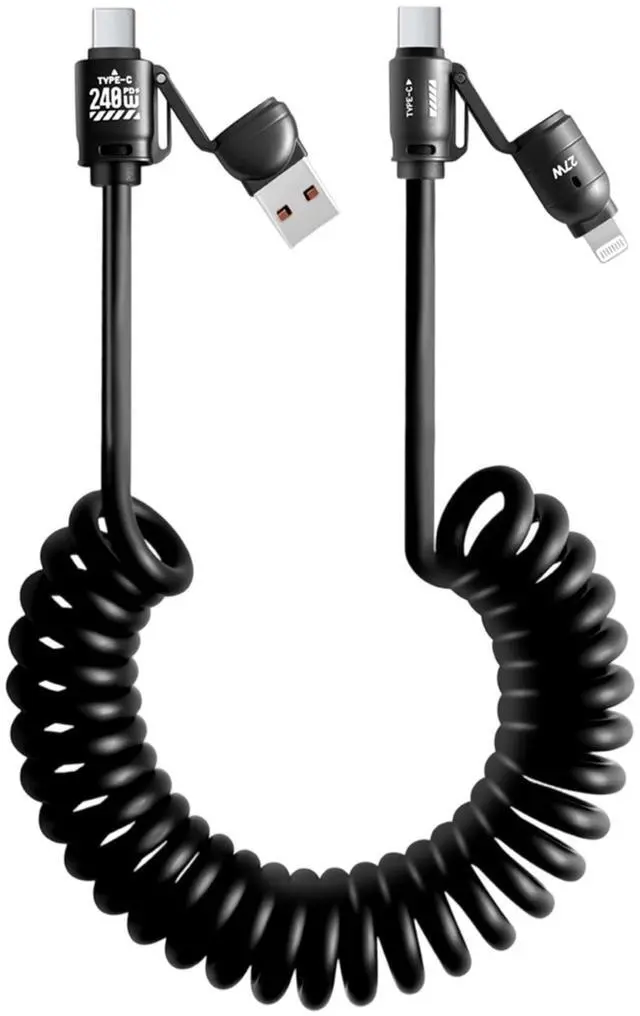 It integrates four common interfaces and is suitable for a wide variety of devices, ranging from iPhones to Android phones and more. With a powerful 240W output power, it can charge your devices at an extremely fast speed, saving you precious time. Its coiled design not only prevents tangling but also makes it extremely convenient to carry. It is suitable for use in the car, outdoors, or in the office, meeting all your charging needs. Upgrade your charging experience right now!