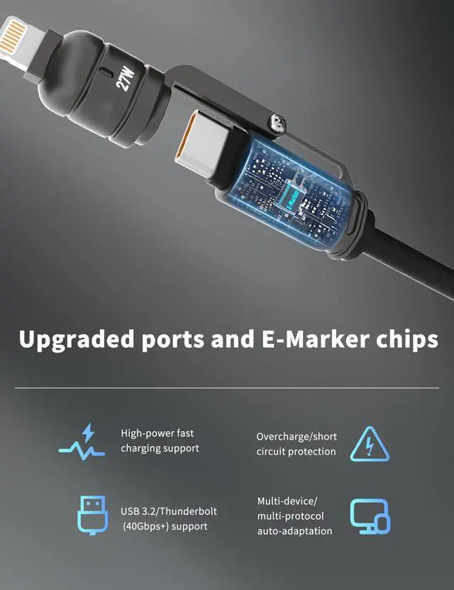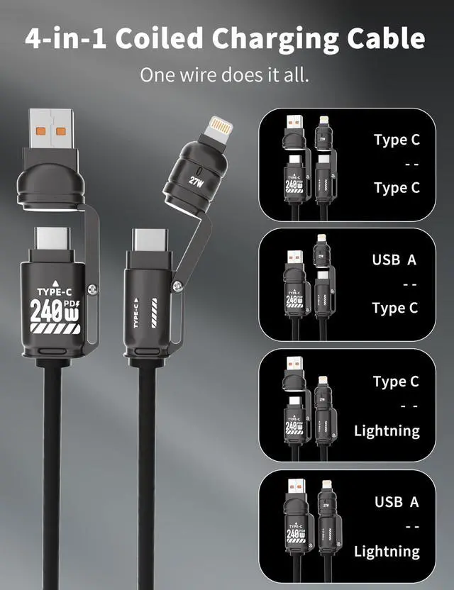 ![Main image of 240W 4-in-1 Retractable Coiled Charging Cable[MFi Certified], Zinc Alloy Fast Charger with PD27W/65W/240W, 2M Braided USB-C/C-L for iPhone 16/15/14, Laptop, Android, CarPlay & CarLife](https://c1.neweggimages.com/productimage/nb640/C5JMD2603230635JN1C.jpg)