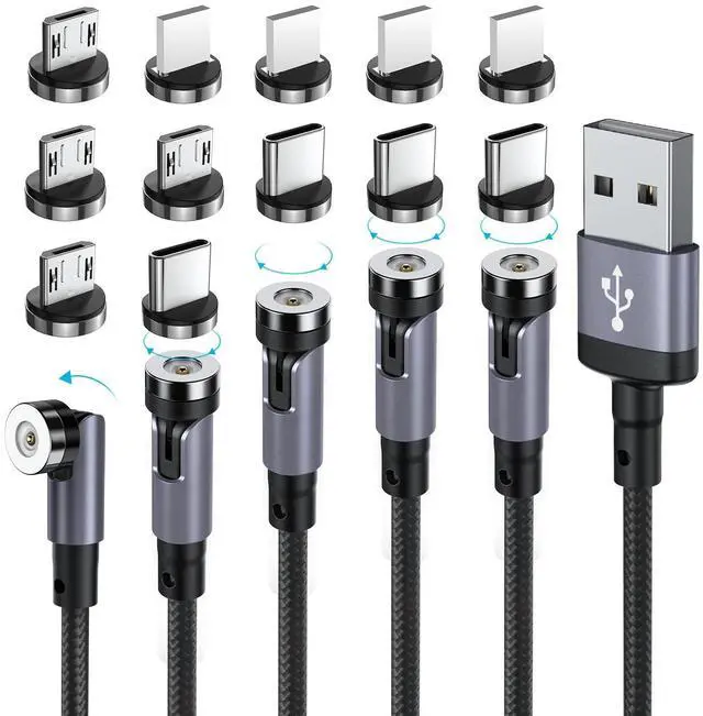 540° Rotation Magnetic Charging Cable, Magnetic Phone Charger with LED [5Pack, 1.6 ft/ 3.3 ft/ 6.6 ft/10ft/10ft] 3 in 1 Magnet Charger for Micro USB/Type C etc Nylon Braided USB Cable Black