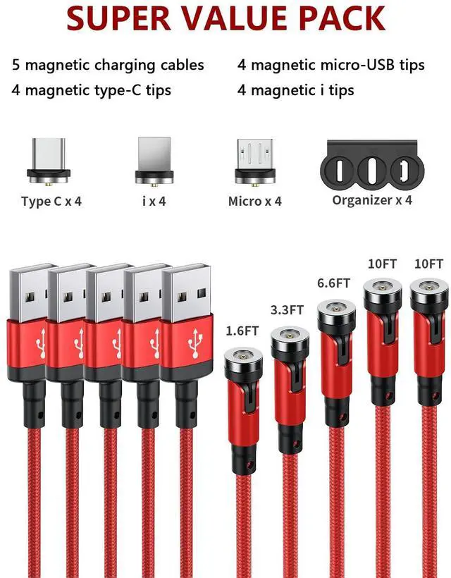 540° Rotation Magnetic Charging Cable, Magnetic Phone Charger with LED [5Pack, 1.6 ft/ 3.3 ft/ 6.6 ft/10ft/10ft] 3 in 1 Magnet Charger for Micro USB/Type C etc Nylon Braided USB Cable Red