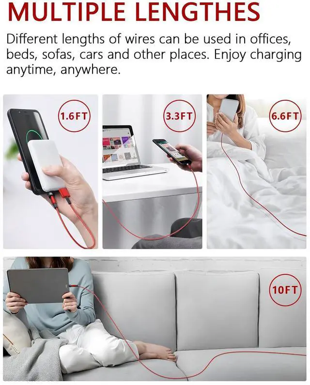 [Multiple Lengths]:USB Cable is made of high-quality aluminum and durable nylon braided fiber, with different length combinations (1.6ft/3.3ft/6.6ft/10ft/10ft), suitable for sofas, beds, offices, cars and other occasions, charging anytime, anywhere