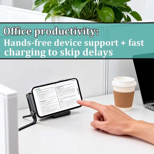 The stand has a non-slip base for stable use. It works with most thin phone cases, but thick or heavy cases, or those with a raised bottom edge, may affect balance. Removing bulky cases is recommended for best support.