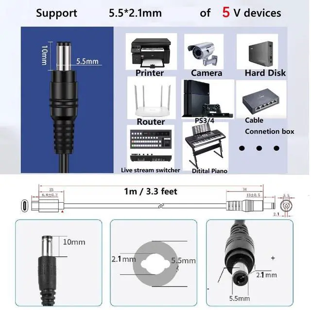 2.Output: DC 5.5mm x 2.5mm, compatible with 5.5mm x 2.1mm Male