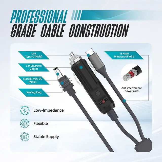 This 2-in-1 Starlink Mini cable combines a USB-C PD plug and a 12V–48V cigarette lighter adapter into one rugged 10FT lead—giving you the freedom to power your Starlink Mini from a PD power bank or any vehicle. Built with heavy-duty 18AWG copper and waterproof housing, it ensures strong, stable power wherever you roam—perfect for off-grid setups, road trips, and remote work sites.