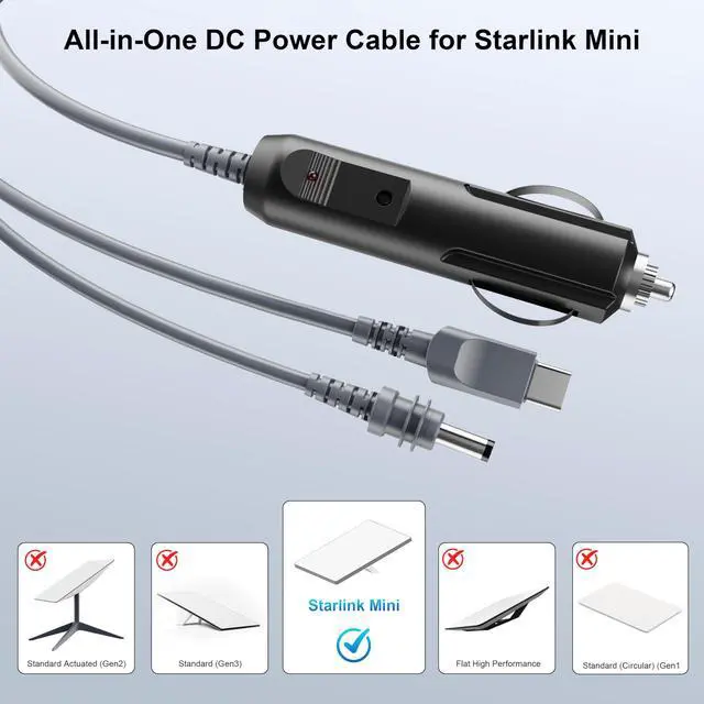 3 in 1 Starlink Mini Cable: Ureegle 10FT/3m Starlink Mini 3-in-1 Cable features a USB-C port, car charger, and DC-to-DC power cable. Power your Starlink Mini anytime, anywhere with just one cable during your outdoor adventures