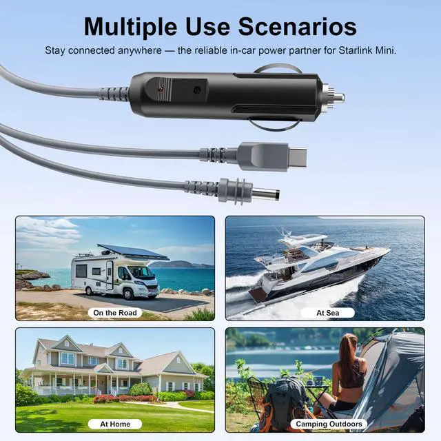 Multi-scenario adaptability: This all-in-one charging cable featuring USB-C, DC, and car charger ports works in virtually any setting. Whether you're in your backyard, camping outdoors, or road-tripping, this extended Starlink Mini charging cable has you covered