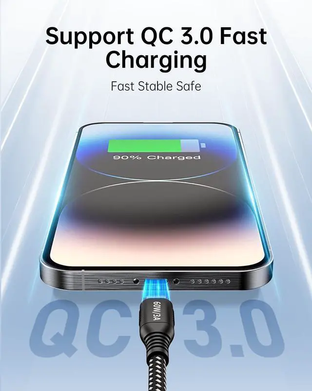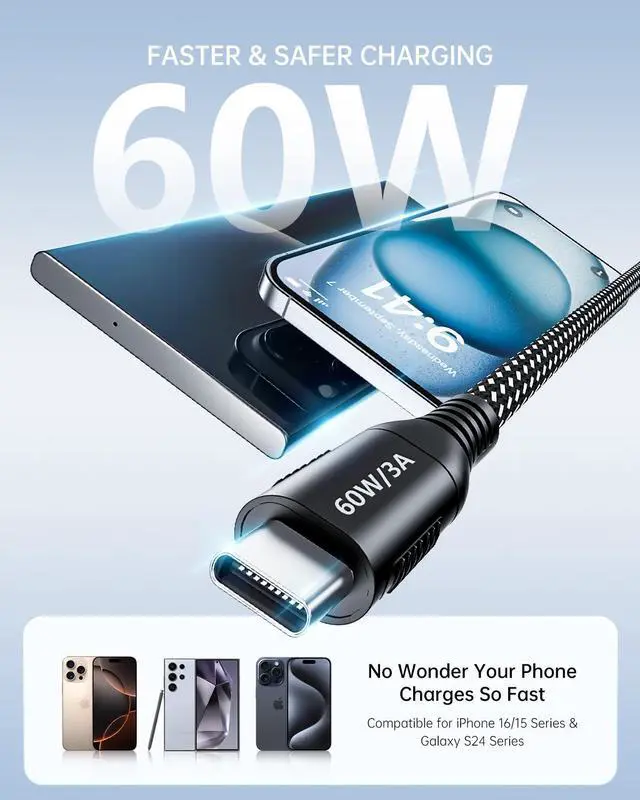 20ft Extra-Long USB-C Cable with 60W Fast Charging: Unlock total charging freedom with our 20ft extra-long USB-C to USB-C cable, offering 60W (3A) high-speed charging without compromise. This extended reach allows you to comfortably use your device from your bed, couch, or deskno need to huddle near an outlet. Designed for durability and consistent performance, it quickly powers MacBooks, iPad Pros, smartphones, and more, making it the perfect all-in-one charging solution for home, office, or travel.