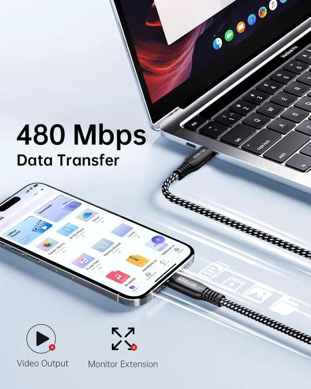 60W Fast Charging & Reliable USB 2.0 Data Transfer: Delivers 60W/3A fast charging, this USB-C cable for iPhone quickly charges your iPhone, MacBook, or other USB C devices. The nylon braided 20-foot ultra-long USB-C to USB-C cable not only enables efficient fast charging but also supports stable USB 2.0 data transfer at 480Mbps, ensuring reliable synchronization of your important files.
