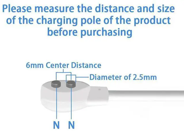 Before purchasing, please be sure tomeasure the center-to-center distance between the two charging poles. Please ensure that the pole of the connection is 2.5mm, and it is the N and N poles, with a center distance of 6mm between the two poles. This versatile charging cable is designed with a 6mm magnetic interface, ensuring exceptional compatibility with a wide range of electronic devices. From rechargeable toys and massagers to electric toothbrushes, children’s watches, dog trainers, and facial cleansers, this charging cable is equipped to handle them all. Enjoy peace of mind knowing that your devices are receiving the exact power they require while eliminating the frustrations of mismatched connectors.