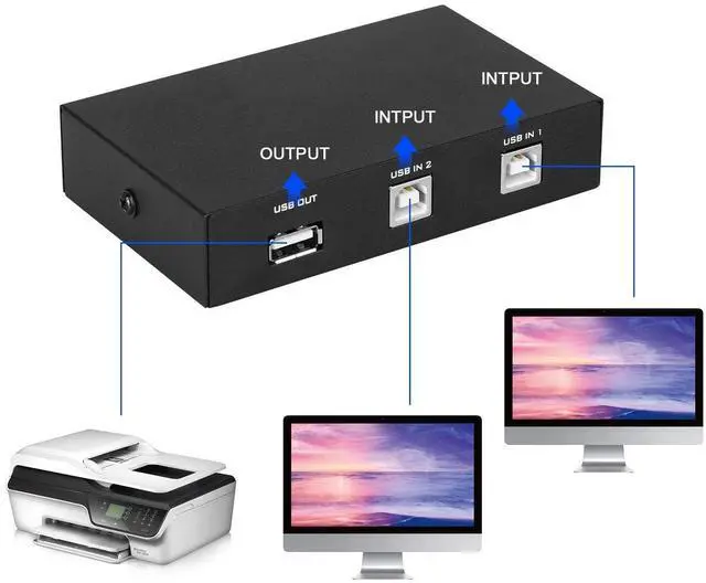 - This printer splitter for two computers eliminates the need for unplugging cables repeatedly. Switch between devices by simply pressing the button on the hub. Great for improving workflow in multi-device environments.