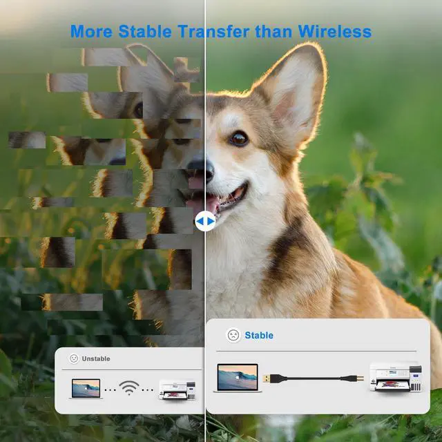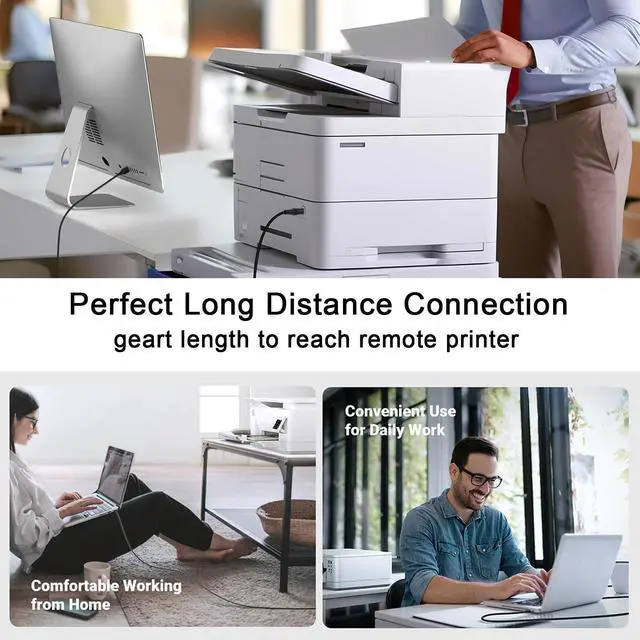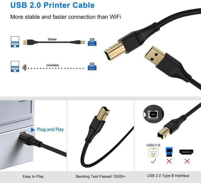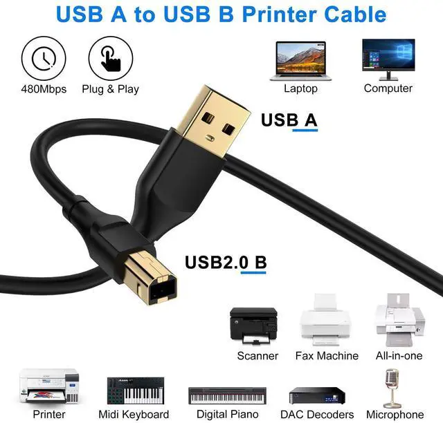 • USB A to USB B printer cable High-Speed Connectivity: Connect your printer, scanner, or external hard drive to your computer with this high-quality USB A to USB B cable. Designed for fast and reliable data transfer, this cable ensures a stable connection between your devices.