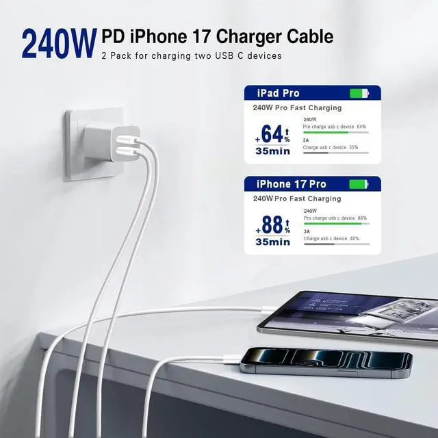 240W Long USB C to C Fast Charger Cable 10ft, Type C to C Super Fast Charging Cord for MacBook Pro/MacBook Air/iPad Pro/Air/Apple iPhone 17 Pro Max/16 15 Plus/Samsung Galaxy S25 S24 S23 Ultra/Laptops
