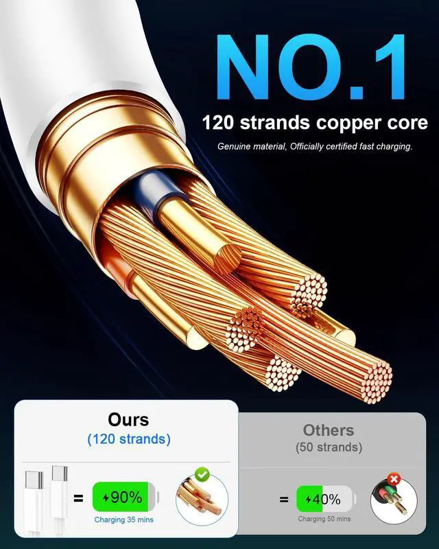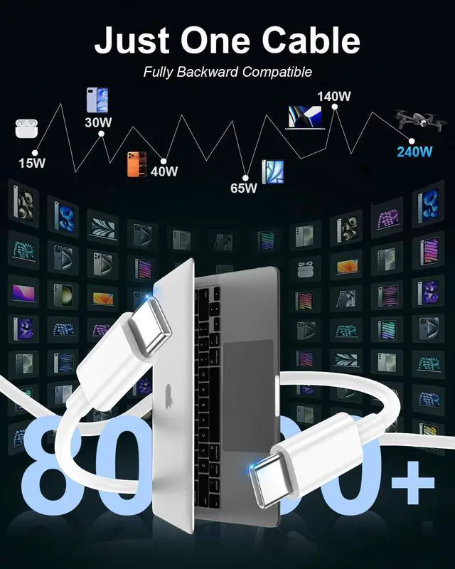 [240W Ultra Fast Charging | Smart Protocol Matching] This usbc to usbc cable upports PD3.1 EPR/QC4.0 fast charging up to 240W Max, working seamlessly with USB-C Power Delivery adapters (e.g.20W/45W/60W/100W/240W). It automatically matches your devices handshake protocol to deliver the maximum safe power it can handleno guesswork, just the fastest possible charge for each gear.