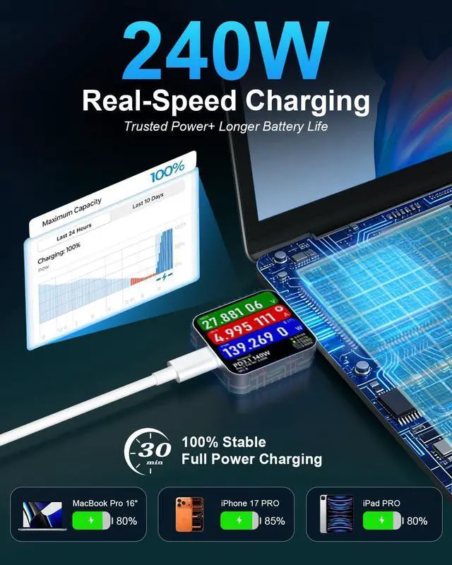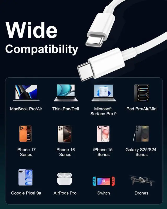 [Wide USBC Compatibility] Works with most USBC phones, tablets, laptops, and gaming devices, including iPhone 15/16/17 series, iPad Pro/Air, MacBook Pro/Air, Samsung Galaxy S series, Steam Deck, and Switch. (Device charging speed depends on device limits.)