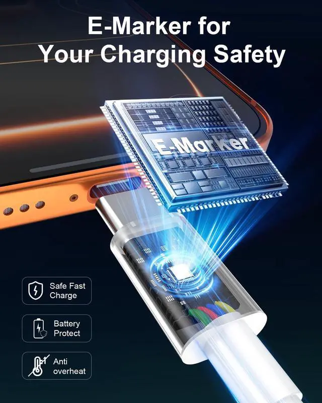 [E-MARK Safe Fast Charging Chip] The advanced E-MARK2.4 chip ensures device safety while allowing for quick charging. The chip guarantees a lower charging temperature to protect your device and automatically stops charging once the device is fully charged, preventing overcharging and extending battery life.