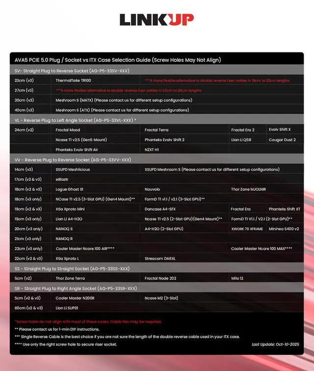 Right Angle (SR) -- [6cm] Cooler Master NR200 (2-Slot GPU) / Cooler Master NR200 (3-Slot GPU) / NCASE M2 (2-slot GPU) / NCASE M2 (3-Slot GPU) -- [10cm] Thermaltake Divider 200 TG -- [15cm] ASUS ProArt PA401 / ASUS Tuf Gaming GT502 / be quiet! Light Base 900 FX / Cooler Master Vertical GPU Mount v3 / CORSAIR 3500 Series / CORSAIR 6500 sERIES / COUGAR FV270 / Deepcool MORPHEUS / Lian Li O11 DYNAMIC XL (with Bracket) / Lian Li O11 Vision (with Bracket) / Lian Li O11 DYNAMIC EVO (with Bracket) / Lian Li O11 DYNAMIC Mini V2 / Lian Li VG4-4 Brackets / MSI Maestro 700L PZ / MSI MAG Pano 100L PZ / NZXT Vertical Mount / NZXT H5 (with Bracket) / NZXT H6 (with Bracket) / NZXT H7 (with Bracket) / NZXT H9 (with Bracket) / Okinos Aqua 9 / Phanteks Eclipse P500A / Phanteks Enthoo 719 / Phanteks Enthoo Pro II / Phanteks Eclipse P600 / Phanteks Eclipse P500 / Phanteks Premium Vertical Bracket / Thermaltake CTE E600 MX - (Configure B) / Thermaltake CTE E660 MX - (Configure B) / Thermaltake Divider 370 TG / Thermaltake The Tower 600 Series -- [20cm] Antec Cannon / ARCTIC Xtender VG / ASUS ROG Strix Helios / ASUS ROG Hyperion GR701 / be quiet! Pure Base 501 LX / be quiet! Light Base 600 LX / be quiet! Silent Base 802 / Cooler Master Elite 301 / CORSAIR 4000 Series / CORSAIR 5000 Series / CORSAIR 7000 Series / Fractal Design Define / Fractal Design Meshify / GAMDIAS NESO P1 / HAVN HS 420 / HYTE Y60 / HYTE Y70 / Midori 5L-V2.2 V2.3 / PCCOOLER CPS C3 T700 ARGB / Phanteks Evolv X / Phanteks NV7 / Phanteks Enthoo Elite / Thermaltake Core P3 Pro (New) -- [25cm] Fractal Design Define 7 XL / Fractal Design Meshify 2 XL -- [30cm] CORSAIR 9000 Series / Phanteks Enthoo 719 -- [40cm] Thermaltake CTE E550 TG - Type C / Thermaltake CTE E600 MX - (Configure C) / Thermaltake CTE E660 MX - (Configure C) -- [50cm] Lian Li O11 DYNAMIC EVO XL Upright Installation - I/O Facing Downward -- [60cm] Lian Li SUP01 / Lian Li O11 DYNAMIC EVO XL Upright Installation - I/O Facing Upward -- [70cm] Lian Li O11 DYNAMIC EVO XL Upright Installation - I/O Facing Downward