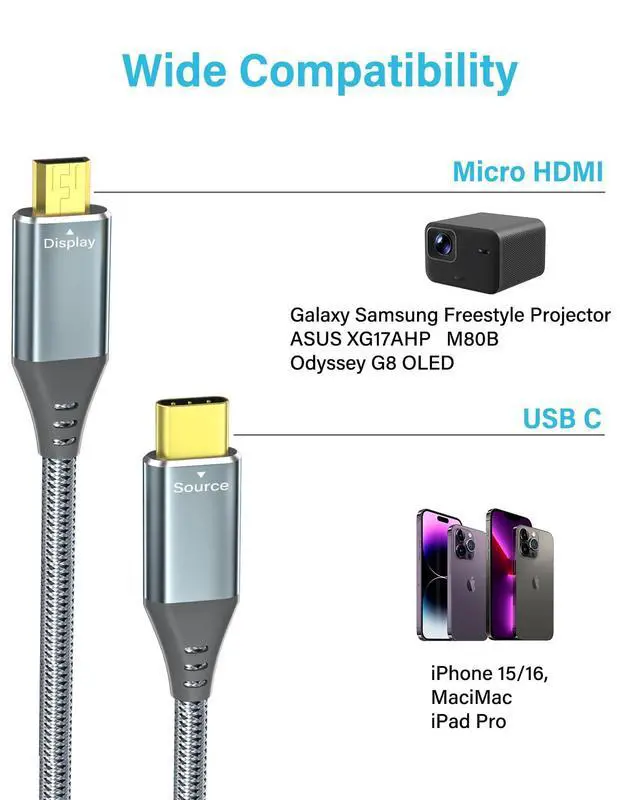 -- Gold-plated connectors ensure zero signal loss between USB-C laptops/phones and Micro HDMI ports on Samsung Freestyle projectors, M80B 4K smart monitors - no driver needed!