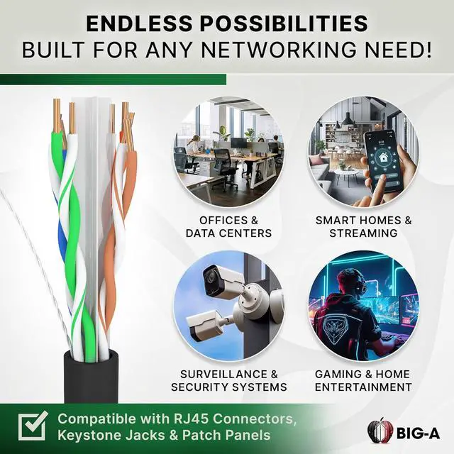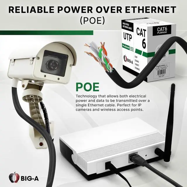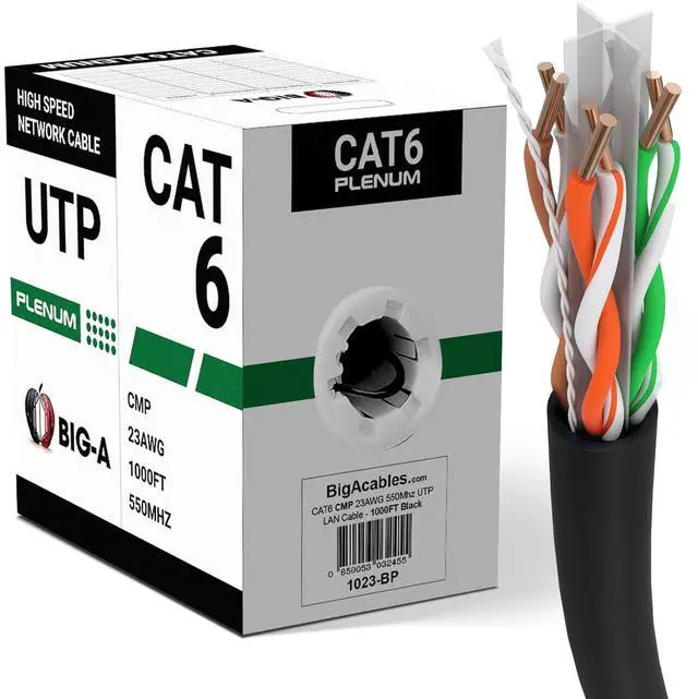 Power up your network with the Big-A Plenum Cat 6 Ethernet Cable, a professional-grade solution for high-speed data transmission in commercial and residential setups. With a CMP plenum rating, this 1000ft bulk cable is specifically designed for safe installation in air-handling spaces, such as ceilings and walls, ensuring compliance with industry safety standards. Built for versatile networking needs, this Cat6 cable is compatible with PoE devices, routers, switches, IP cameras, VoIP systems, and more. Whether you're setting up a home network, office, or large-scale commercial infrastructure, this cable provides the durability and flexibility needed for seamless connectivity. Engineered to handle up to 10Gbps speeds and 550MHz bandwidth, this unshielded twisted pair (UTP) cable minimizes interference and enhances signal stability. It features 23 AWG solid copper-clad aluminum (CCA) conductors, delivering reliable performance for modern networking applications. Why Choose Big-A Cat 6 Plenum Cable? Superior Data Transfer Supports up to 10Gbps Ethernet speeds with 550MHz bandwidth, ensuring smooth, high-speed performance. Plenum-Rated for Safety Meets CMP fire and safety regulations, making it ideal for air ducts, drop ceilings, and enclosed spaces. High-Quality UTP Construction Designed to reduce signal interference and enhance transmission clarity. Easy Pull Box Design Comes in a 1000ft tangle-free spool, making installations faster and hassle-free. Versatile Networking Solution Works with Cat6, Cat5e, and Cat5 devices, supporting security systems, networking infrastructure, and enterprise applications.