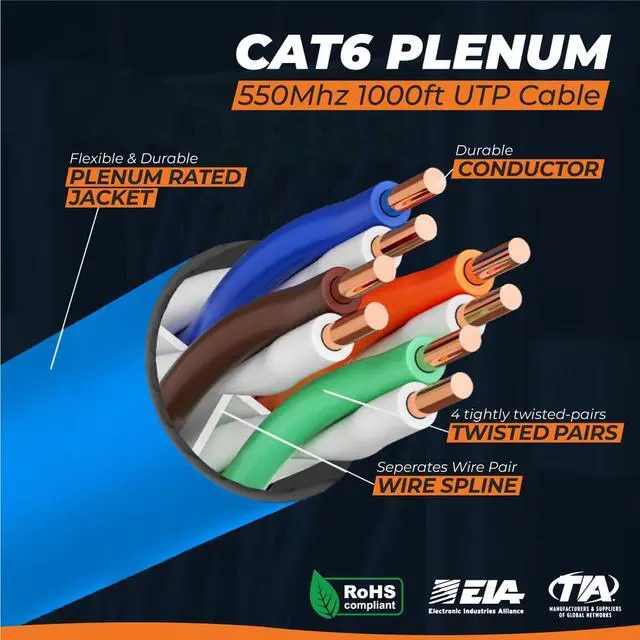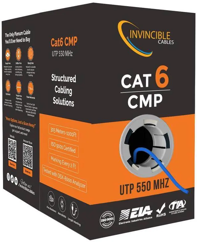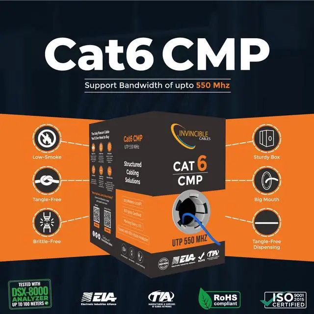 Transmission StandardCategory 6 ANSI/TIA-568.2-DBandwidth Support1000BASE-T up to 328 feet, 10GBASE-T up to 180 feet, Performance tested up-to 600MHzFire RatingCMP (Plenum)UV Rated? NoDirect Burial Rated? NoTemperature Range -20°C to 75°CVoltage Rating300VConductors0.57MM,23AWGShielded? No U/UTPSpline (Internal Separator)?YesInsulation ColorsTIA Standard (Blue + White/Blue, Orange + White/Orange, Green + White/Green, Brown + White/Brown)Insulation Diameter1.00mm ± 0.05mmJacket Diameter 6.00mm ± 0.35mmCapacitance Unbalance 330 pFConductor DC Resistance at 20C 9.50 Ohms What makes our products unique? Choose Invincible Cables for Low Voltage Cable Excellence! Superior Construction Durable and Reliable What Makes us Standout Really. Low. Prices. Product Specifications & Features