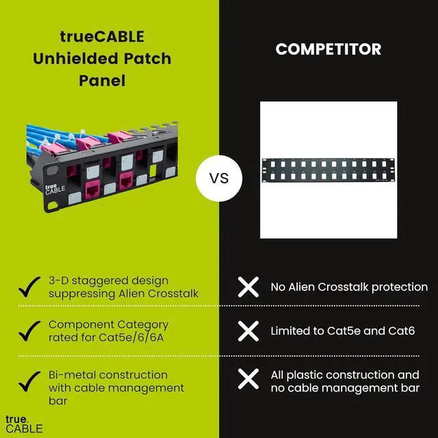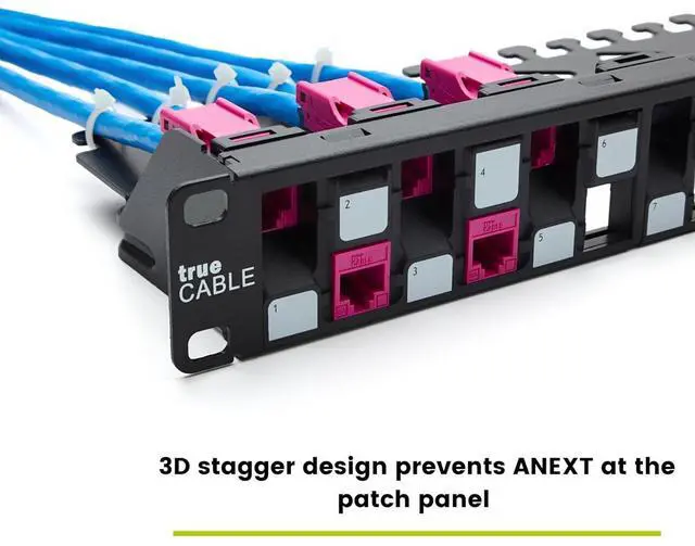 COMPONENT RATED FOR 10G NETWORKS. Unique 3-D staggered design offsets unshielded keystone jacks in a three dimensional pattern to mitigate alien crosstalk (ANEXT) at the patch panel. Designed specifically to achieve ISO/IEC-11801 and ANSI/TIA 568.2-D Cat6A Component Rated performance when combined with trueCABLE Cat6A Component Rated unshielded keystone jacks.