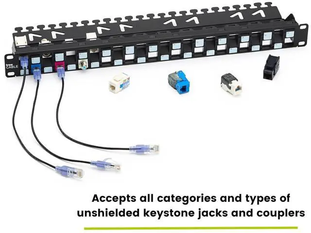 COMPATIBLE. Tested and certified with trueCABLE tool-less, punch down keystone jacks, and couplers. Works with industry standard snap-in HD Ethernet keystone jacks and couplers. Designed specifically for Ethernet communications cable and hardware. This panel will accept BNC, RCA, HDMI, USB, fiber optic, and snap-in Coaxial couplers, however using the recessed ports (12 out of the 24) may result in oversized cabling/connectors to not physically fit. Please confirm compatibility.