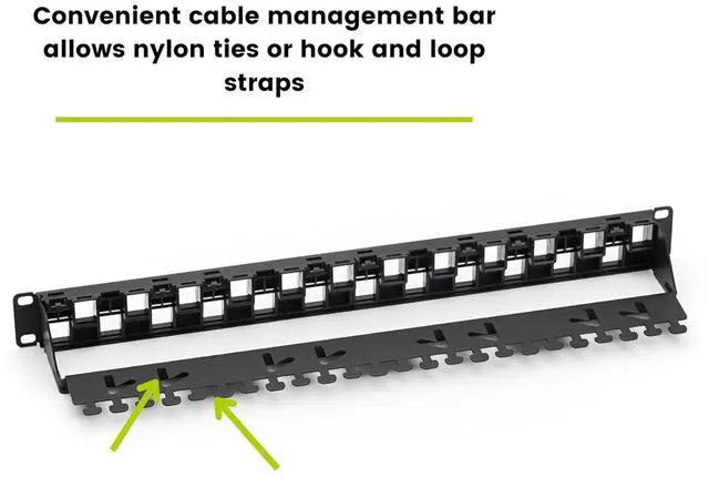 VERSATILE. Designed for Cat6A unshielded keystone jacks and U/UTP (unshielded) Ethernet cable. Fully backwards compatible with Cat5e and Cat6. Accepts tool-less and 110 punch down style jacks. The unique cable management bar accepts hook and loop straps for bundling cables or nylon ties. Not recommended for shielded Ethernet cable.