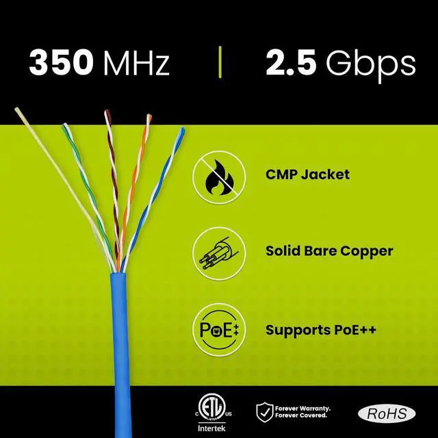 [High Performance Network Cable] This plenum rated cat 5e ethernet cable is 24 AWG with 4 pairs (8C). Suitable for 1 Gigabit speed and 2.5 Gigabit (2.5GBASE-T) speeds up to 328 feet. Bandwidth tested up to 350 MHz. Supports Power over Ethernet: PoE/PoE+/PoE++ (IEEE 802.3af/at/bt) 4PPoE up to 100W.