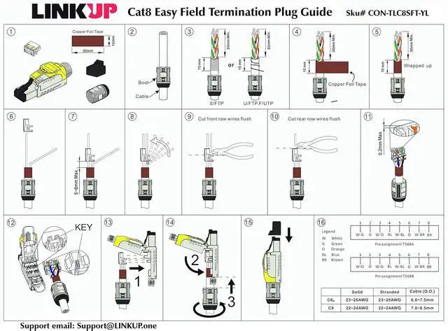 Warning: Please avoid "FLAT" and THIN cables as they all failed in the 10Gbps speed tests and failed for the LINKUP connector to cut through the wires to make good contact. Certified Cat8 Bulk Cable: B07JQ2GSFQCertified Tool-less Keystones: B08BCR14DBPressing Tools: B07JQ61FYSCertified 40G Patch Cords: B07VWL4WHG