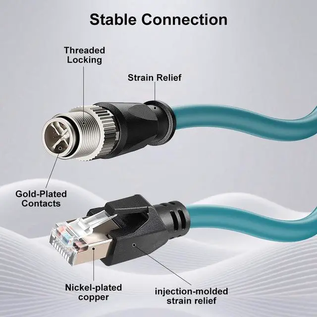 More DurableM12 connector are IP67 waterproof rating, protecting against liquids and particulate. Featuring shielded RJ45 Connector and over-molded strain reliefs on both connectors to protect against electrical interference. Highly flexible drag chain cable, abrasion and bending resistance.