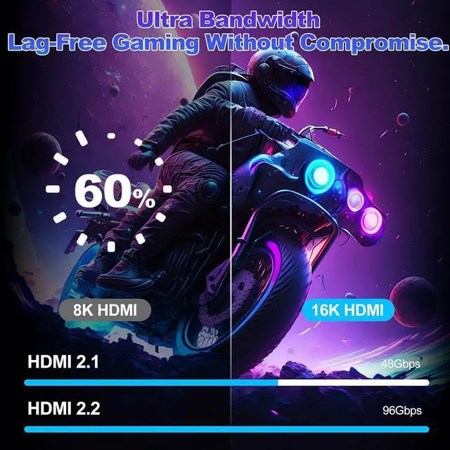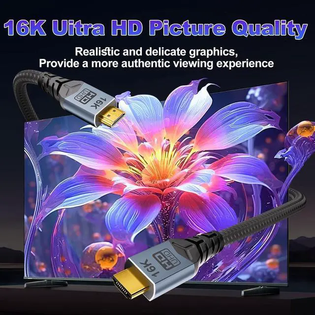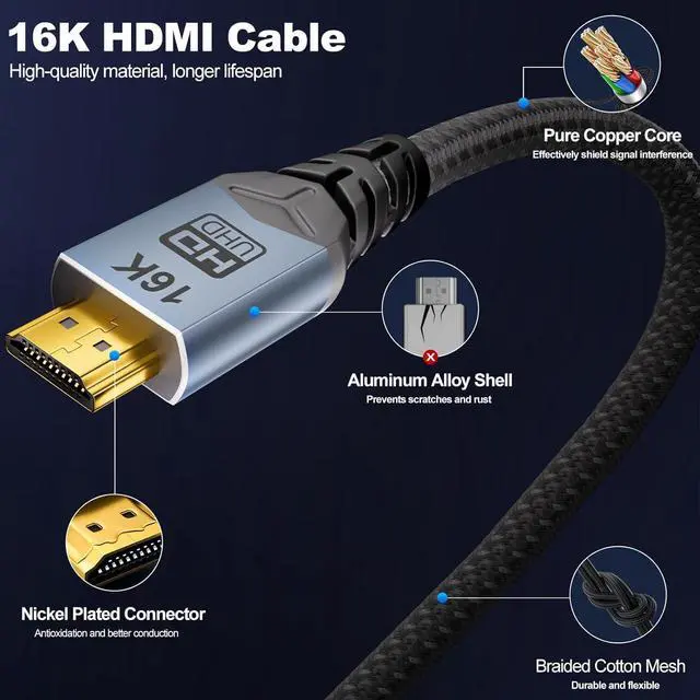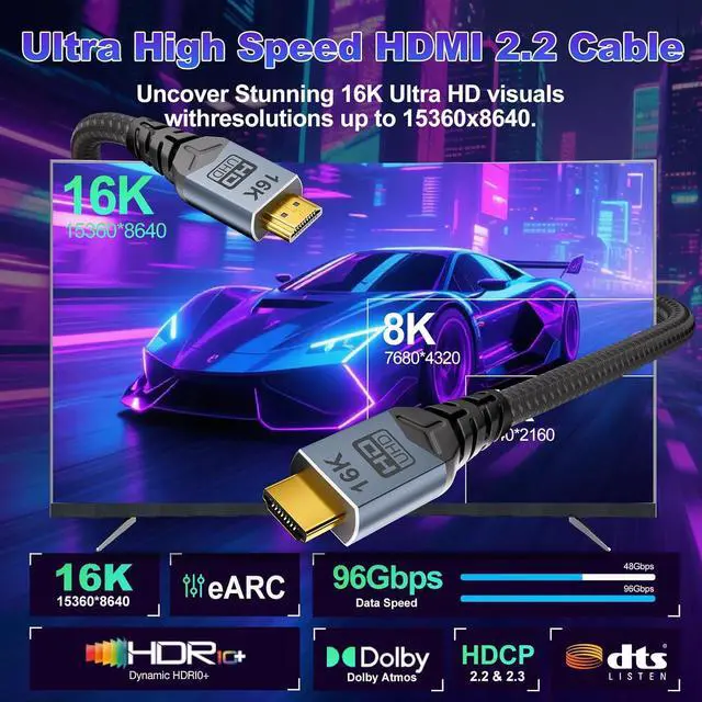 HDMI 2.2 Cable16K HDMI 2.2 CableEquipped with ultra-high-speed 96Gbps transmission, it unlocks full-spec ultra-high resolutions including 16K@60Hz, 8K@240Hz, and 4K@480Hz, covering all mainstream refresh rates! Perfectly compatible with next-gen gaming and 12-bit HDR visuals, while fully backward compatible with all HDMI devices for seamless connectivity between new and old equipment.