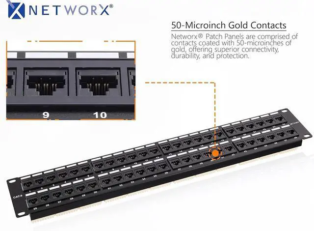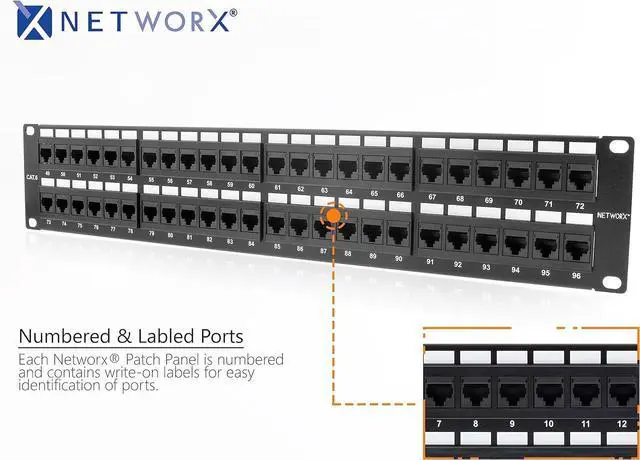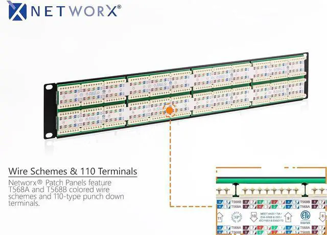 Getting the most out of your network has never been easier with CAT6 Patch Panels from Networx. Looking for tough? Look no further because these high-quality patch panels are built using black electrostatic powder-coated steel which can stand up to extreme conditions. Stay organized with built in cable management and easy write-on labels. By having a clear wiring guide on the punch-down side of the patch panel you'll never have to guess the wiring order ever again. Rated up to 1Gbps these CAT6 Patch panels meet or exceed the specifications put forward in TIA/EIA 568-B.2. High-Quality CAT6 Patch Panel Ports - 96 CAT6 TIA/EIA 568-A/B Standards Compliant 110 Style Punch Down 568-A/B Wiring Code Includes 16 Natural Cable Ties TAA Compliant RoHS Compliant UL Listed
