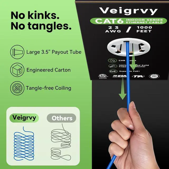 Solid Bare Copper Conductors: Veigrvy Cat 6 Ethernet cable employs solid bare copper and 23AWG core wires, ensuring low attenuation and stable long-distance performance. offers lower resistance, a longer lifespan, and reliable POE+ power supply